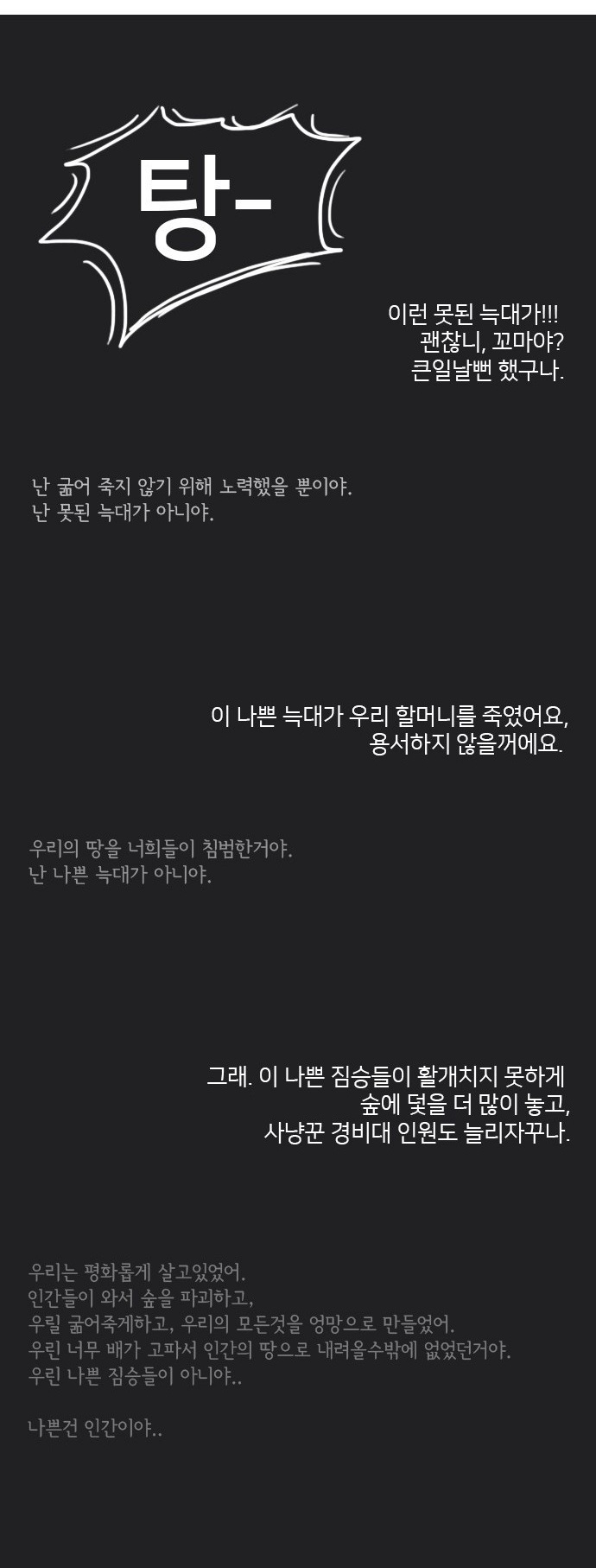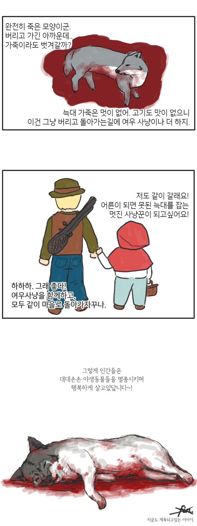 [비아냥툰] ② 늑대와 빨간 두건(下) 랑문화예술발행 2025년 12월 26일편집 2025년 12월 26일조회 127 어쩌면 우리는 늘 인간의 관점으로 세상을 보면서 그것이 당연하다고 착각하며 살고 있지는 않나? 동물의 관점을 상상해본 웹툰. 어쩌면 잔혹극과 반성문의 사이 그 어디쯤에 있는 〈늑대와 빨간 두건(下)〉. 근본생태주의 동물권 생태위기 웹툰 인간 *[비아냥툰] ① 늑대와 빨간 두건(上)_2025년 12월 3일에서 이어집니다. 2016~2017년 네이버 도전웹툰에 연재했던 동물권을 주제로 한 웹툰입니다. 관련글 [비아냥툰] ① 늑대와 빨간 두건(上) 랑 조회 730