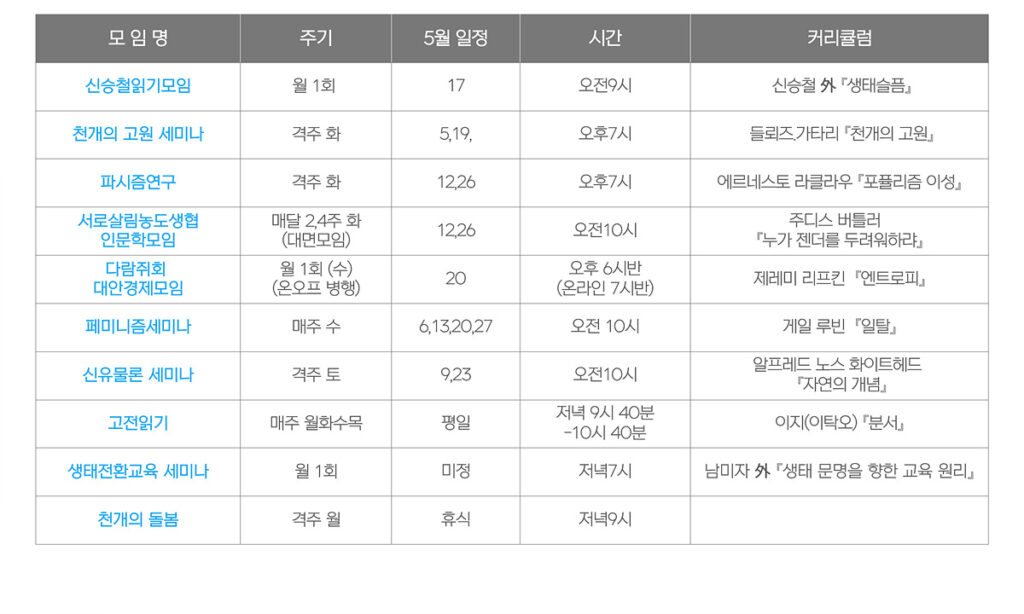 (세미나는 일방적인 교육 시스템이 아닌 구성원들이 함께 지혜를 모아가는 과정이기에, 교육비나 참가비 없이 무료로 진행됩니다. 다만, 다함께 만들어가는 자리인만큼 관계망을 돌보고 활력을 나누는 데 적극 참여해주시기 바랍니다.)