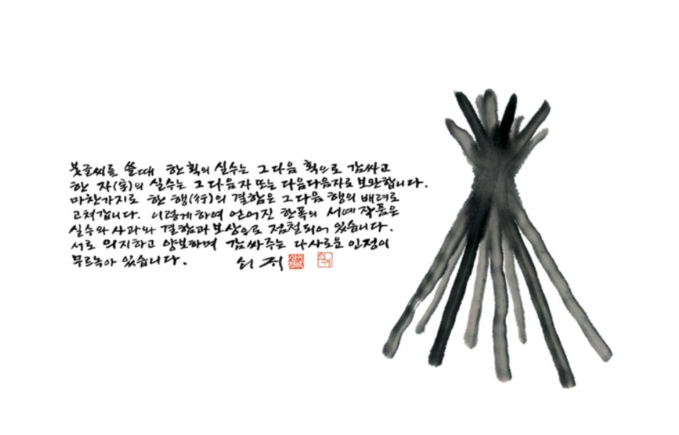 붓글씨 쓸 때 획도 흡사 사람과 같아서 독존(獨存)하지 못하는 ‘반쪽’인 듯합니다. 마찬가지로 한’자’가 잘못된 때는 그 다음 자 또는 그 다음다음 자로써 그 결함을 보상하려고 합니다. 또 한 ‘행'(行)의 잘못은 다른 행의 배려로써, 한’연'(聯)의 실수는 다른 연의 구성으로써 감싸려 합니다. 그리하여 어쩌면 잘못과 실수의 누적으로 이루어진, 실패와 보상과 결함과 사과와 노력들이 점철된, 그러기에 더 애착이 가는, 한 폭의 글을 얻게 됩니다. 이렇게 얻은 한 폭의 글은, 획, 자, 행, 연 들이 대소, 강약, 태세(太細), 지속(遲速), 농담(濃淡)등의 여러 가지 형태로 서로가 서로를 의지하고 양보하며 실수와 결함을 감싸주며 간신히 이룩한 성취입니다. (신영복, 「서도의 관계론」(1977.04.15.), 『감옥으로부터의 사색』, 101) 중에서