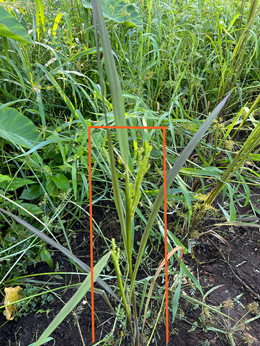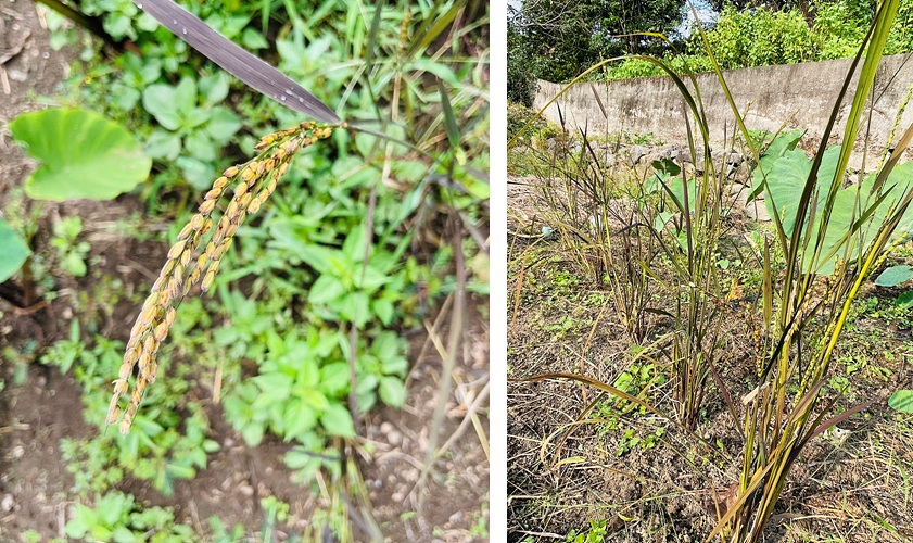 여러 풀들 사이에 보이시려나 모르겠네요. 나락을 맺기 시작한 밭벼가 보이세요?
